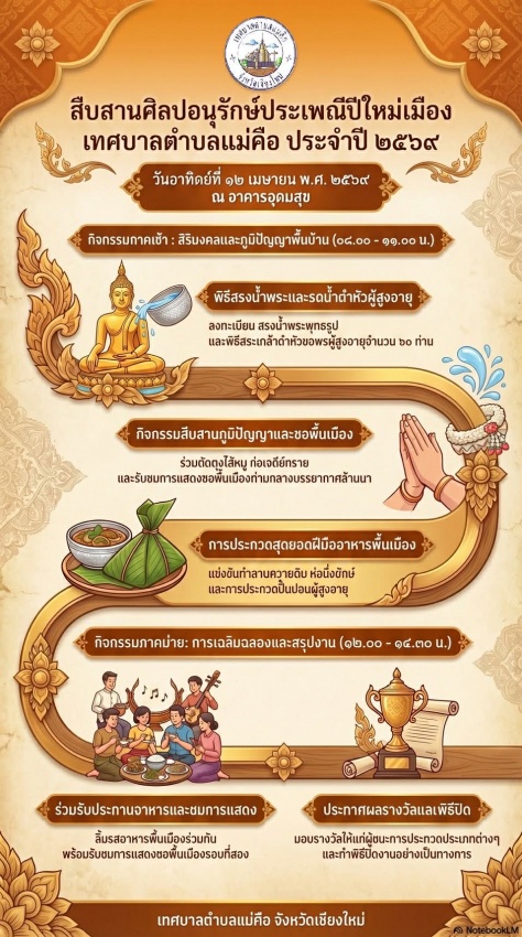 ประชาสัมพันธ์ ขอเชิญชวนประชาชนเข้าร่วมกิจกรรมปี๋ใหม่เมืองเทศบาลตำบลแม่คือ ในวันที่ 12 เมษายน 2569
