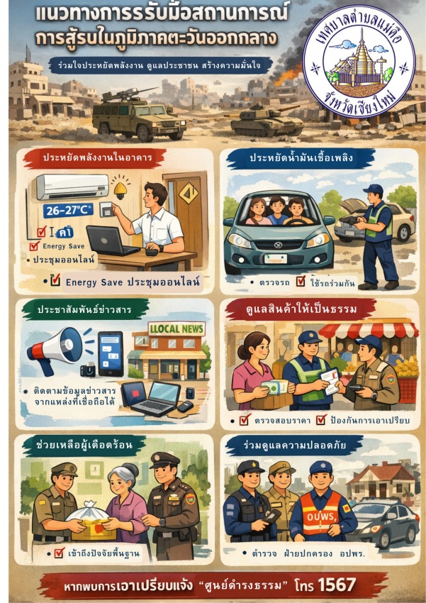 | 1 | แนวทางการรับมือสถานการณ์การสู้รบในภูมิภาคตะวันออกกลางของทศบาลตำบลแม่คือ เพื่อติดตาม เฝ้าระวัง และเตรียมความพร้อมรองรับผลกระทบที่อาจเกิดขึ้นจากสถานการณ์การสู้รบในภูมิภ | 585 KB. | 0 |