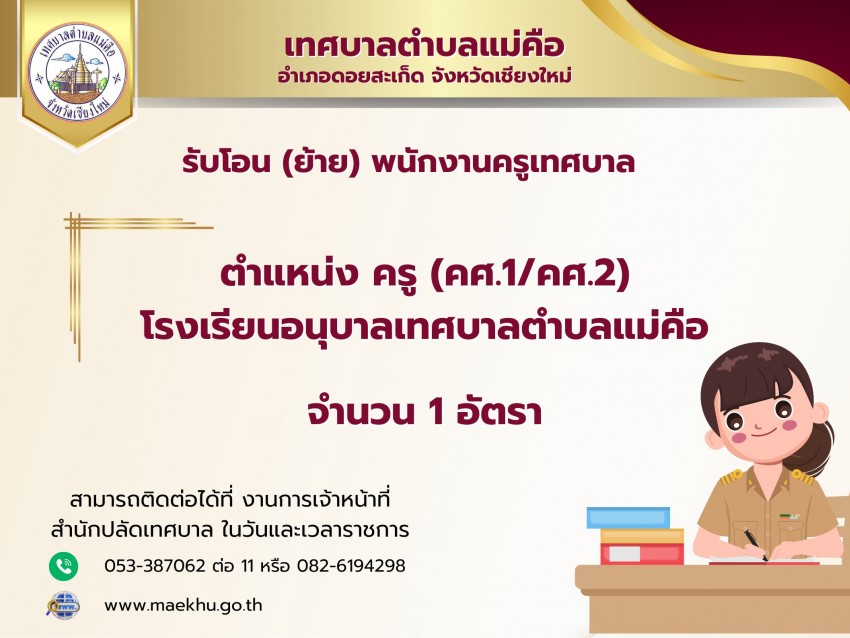 - ประกาศเทศบาลตำบลแม่คือ เรื่องรับสมัครนักเรียน นักศึกษา ปฏิบัติงานช่วงปิดเทอม ประจำปีงบประมาณ พ.ศ.2568(04 มี.ค. 68)